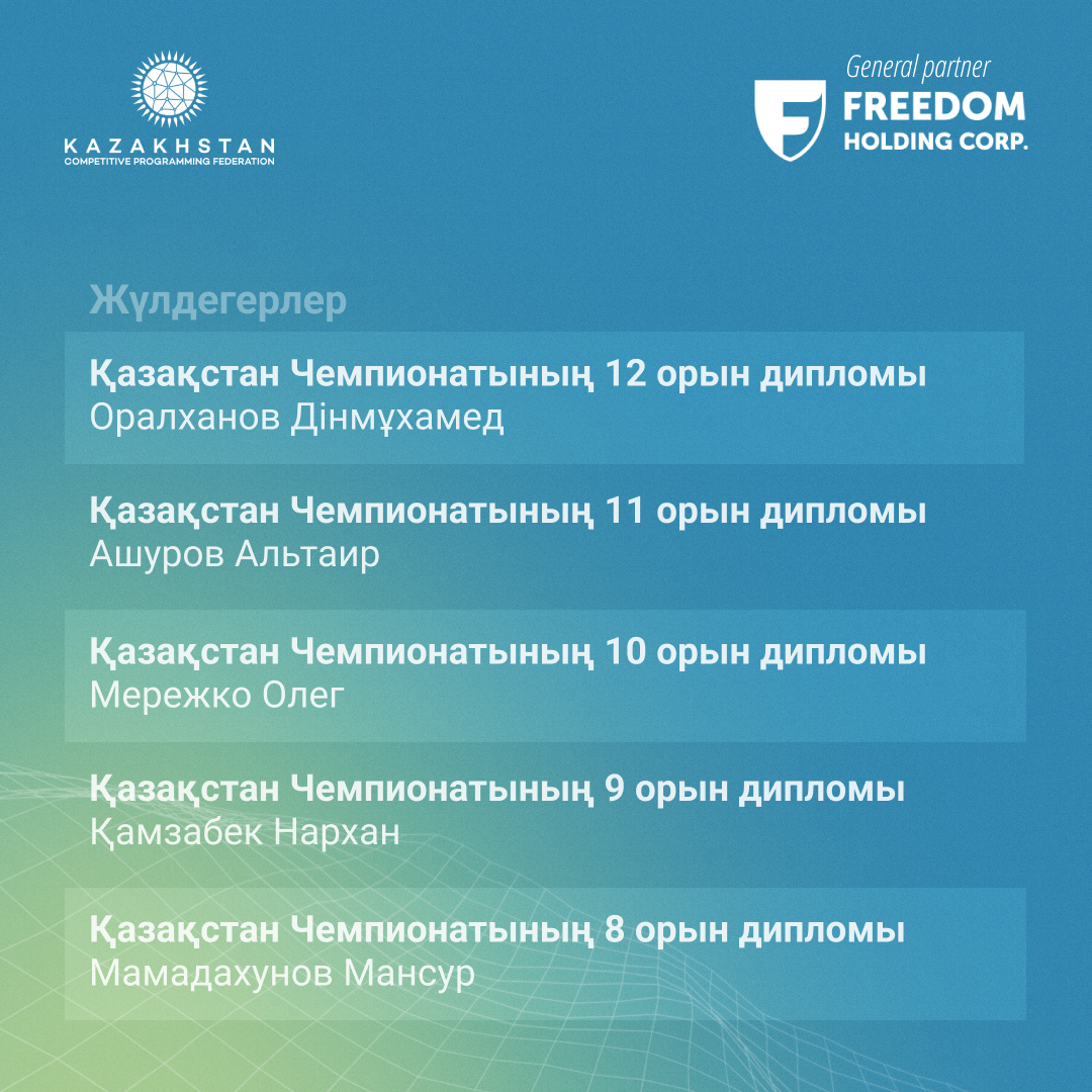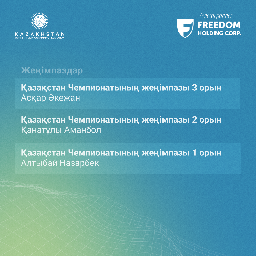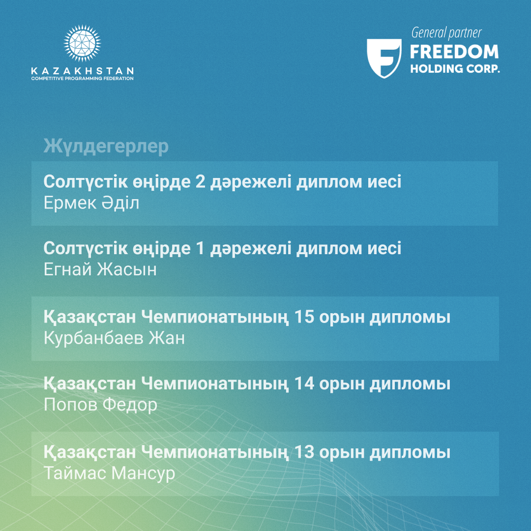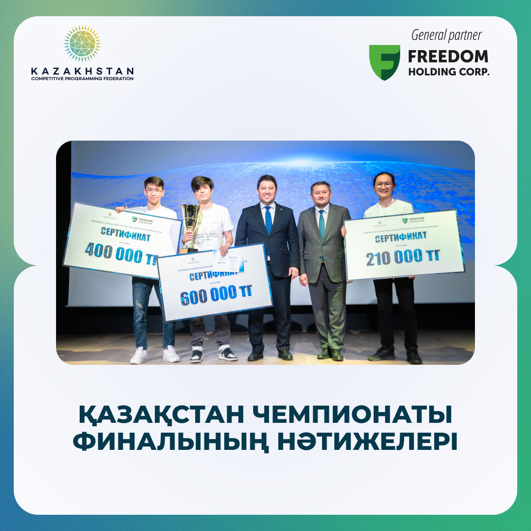 Спорттық бағдарламалау бойынша 2024 жылғы Қазақстан Чемпионатының Финалының нәтижелерімен бөлісеміз! Биылғы жылы іс-шара Қазақстанның түкпір-түкпірінен 40 үздік қатысушыны жинады, олардың арасында спорттық бағдарламалауға деген ортақ құштарлық біріктірілген оқушылар, студенттер мен жасөспірімдер болды. Барлық қатысушылар күрделі есептерді шешіп, чемпион атағы үшін жарыса отырып, жоғары дайындық деңгейі мен табанды спорттық рухты дамытты.