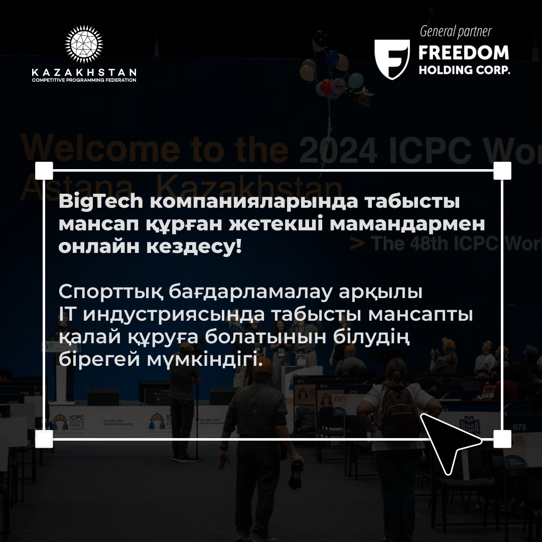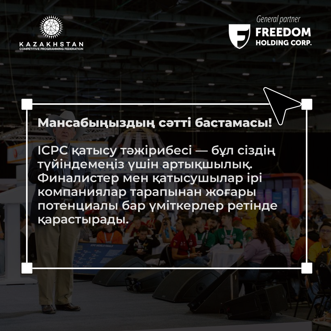 Жарысқа қатысу сізге спорттық бағдарламалау дағдыларын дамытуға, кәсіби байланыстарды кеңейтуге және табысты мансапқа жол ашуға көмектеседі!